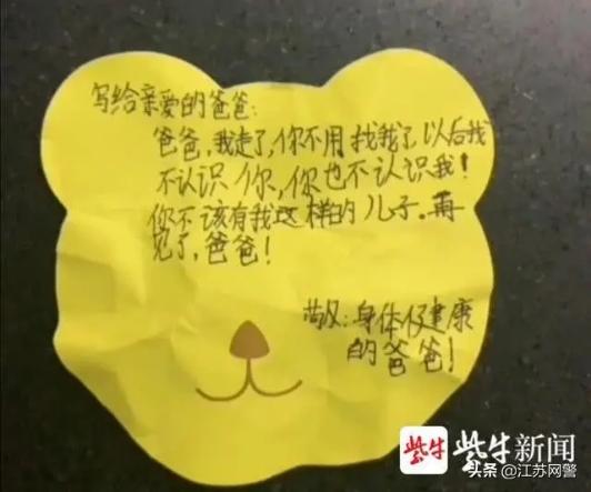 4月4日,南京六合区一名叫天天的男孩,因为自己的学习成绩不是很理想,父亲责备了他几句后,他留下这张纸条后离家出走了。